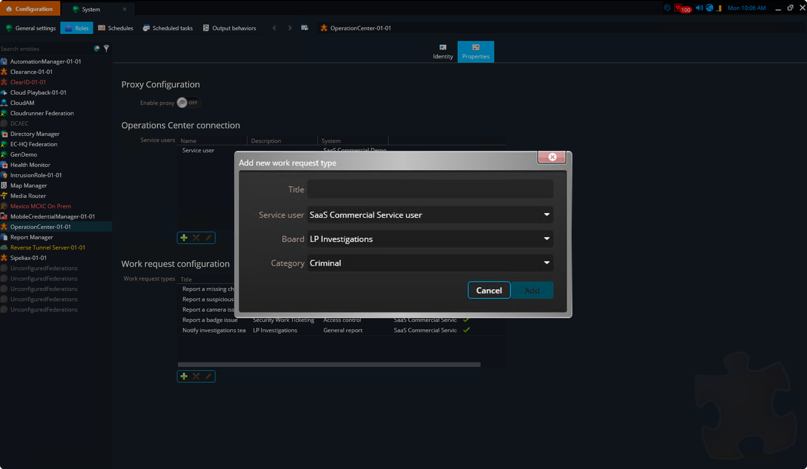 Click the + icon to add a work request type. This allows you to configure the details of the card that will be created in Operations Center when using the one-click work request creation feature in Security Center SaaS.