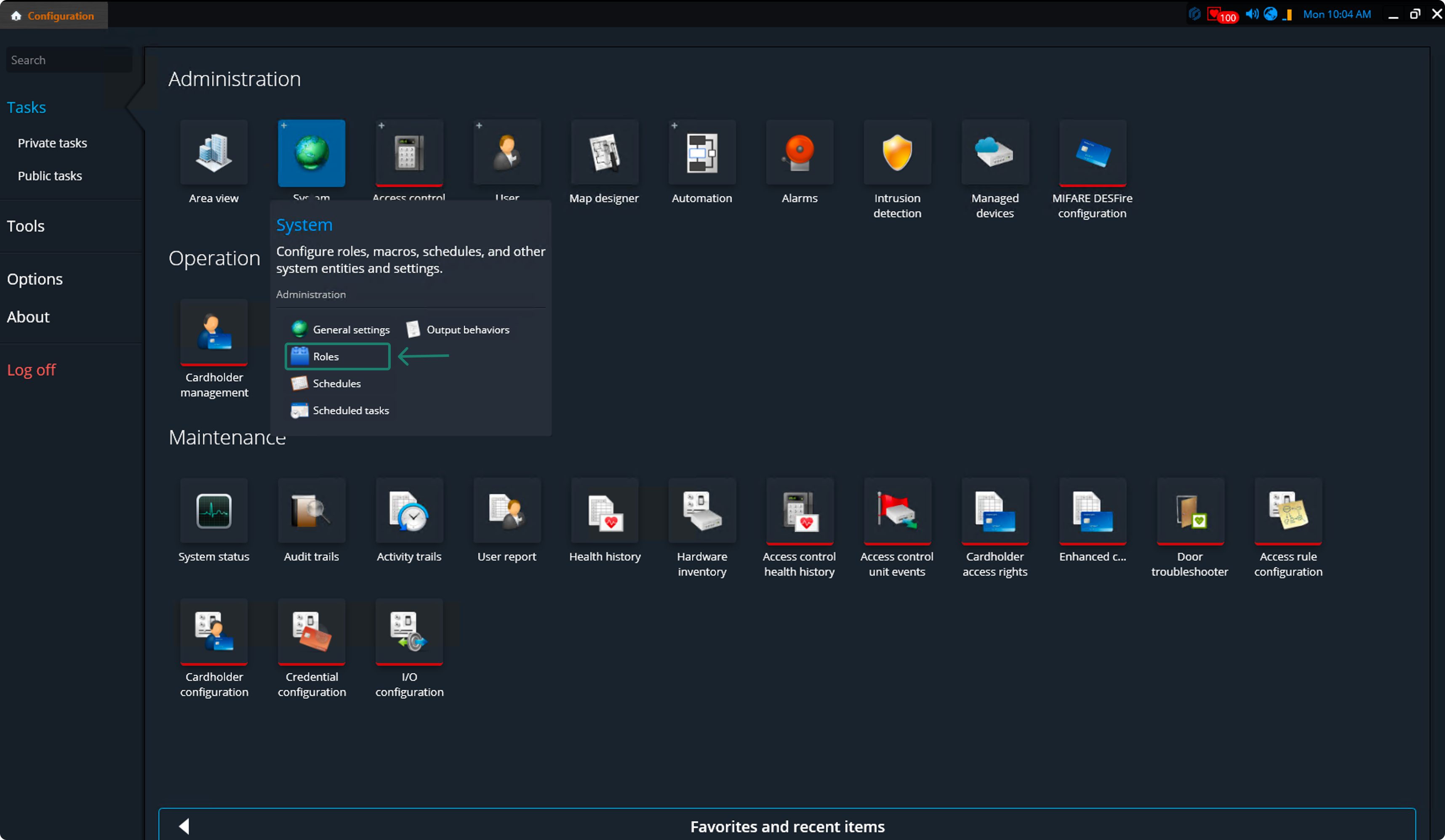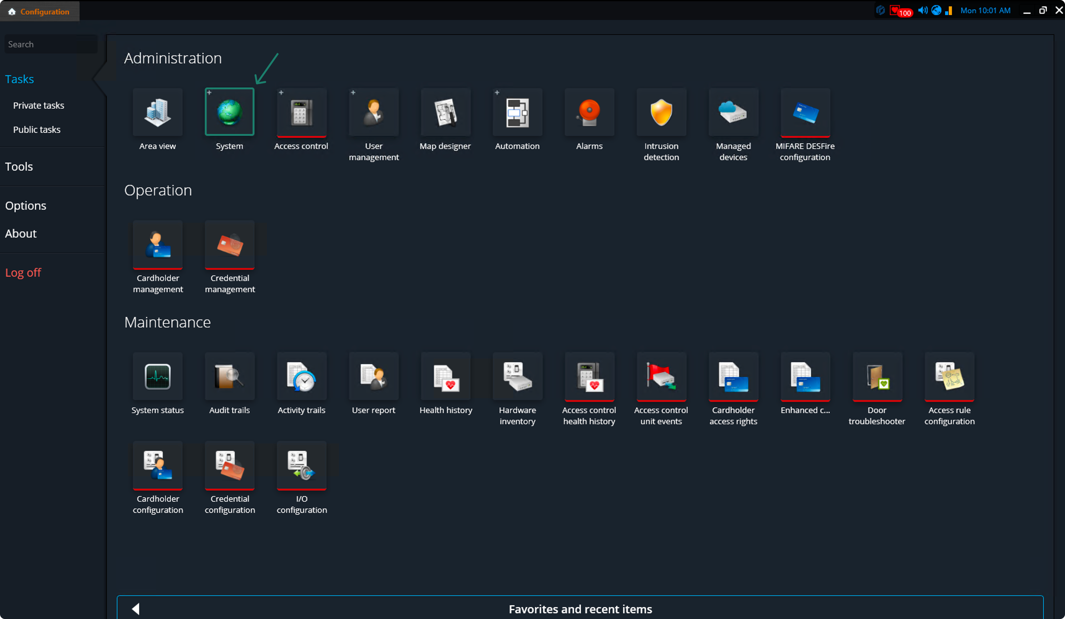 To enable work requests from Security Center SaaS to Operations Center, you must configure the work request type.To do so, Open the Configuration application and hover over the System tile.