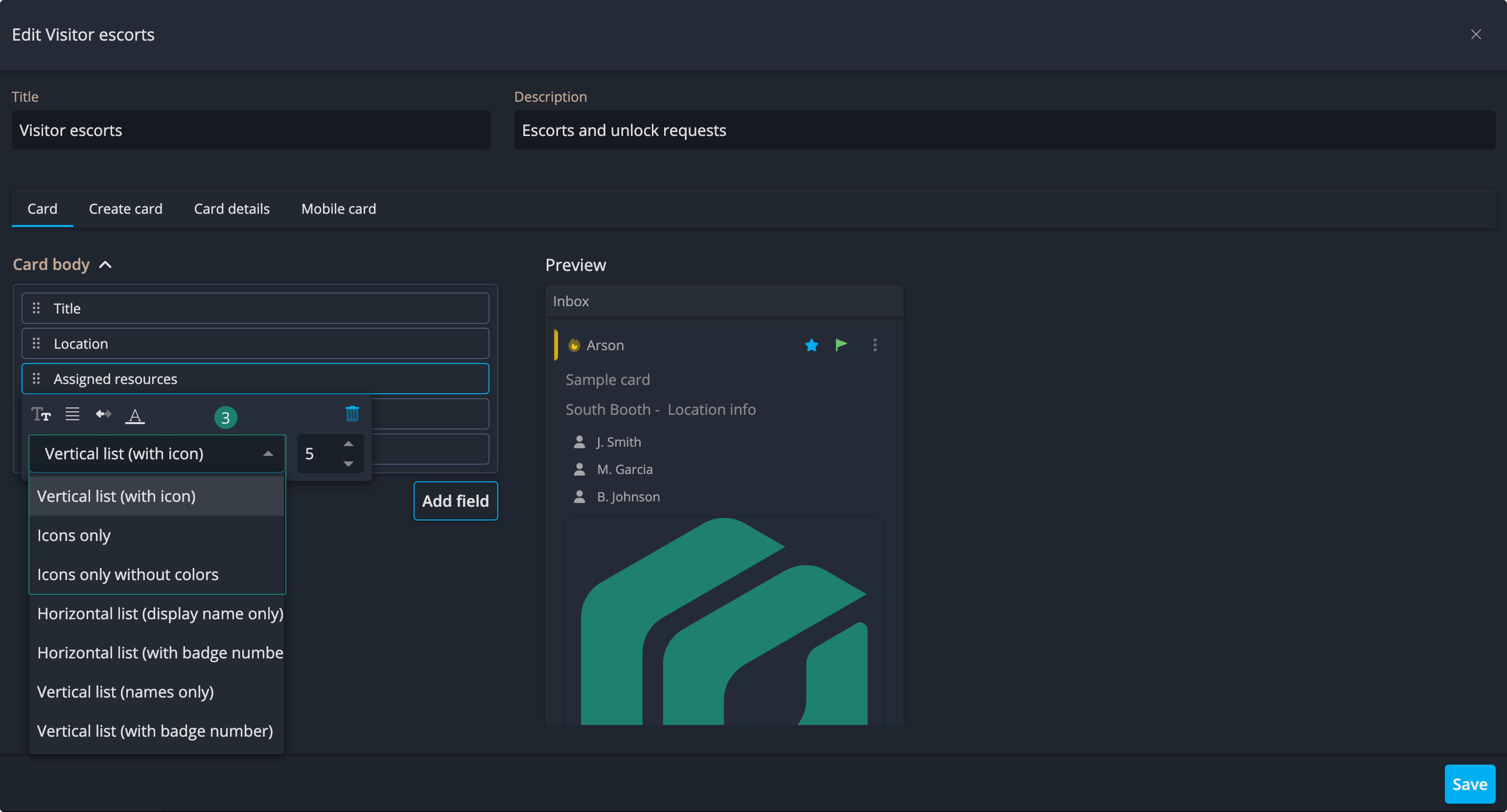 - In the configuration panel, make sure the Assigned Resource field is added to the card display.